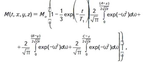 где М0 - равновесное значение намагниченности в поре; Т1(х, у, z) - время спин-решеточной релаксации компонент воды; D- коэффициент самодиффузии; Δ- оператор Лапласа.