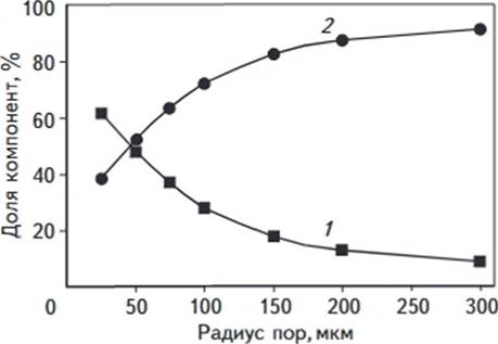 Рис. 8. ЗАВИСИМОСТЬ ПРОЦЕНТНЫХ ДОЛЕЙ КОМПОНЕНТ ВОДЫ ОТ РАДИУСА ПОР