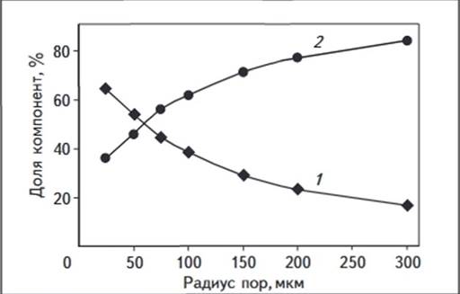 Рис. 6. ЗАВИСИМОСТЬ ПРОЦЕНТНЫХ ДОЛЕЙ КОМПОНЕНТ ВОДЫ ОТ РАДИУСА ПОР