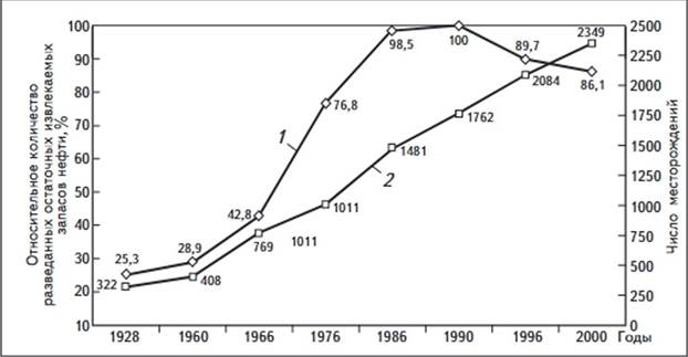 Рис. 1. ИЗМЕНЕНИЕ РАЗВЕДАННЫХ ОСТАТОЧНЫХ ИЗВЛЕКАЕМЫХ ЗАПАСОВ НЕФТИ (1) И ЧИСЛА ОТКРЫТЫХ МЕСТОРОЖДЕНИЙ (2) ВО ВРЕМЕНИ