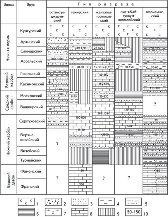 По особенностям геологической структуры и литолого-фациальным характеристикам осадочного комплекса восточной части Прикаспийской впадины выделяются фациальные зоны, соответствующие установленным структурно-формационным зонам (рис. 1), в которых развиты несколько типов палеозойских разрезов: остансук-джурунский (актюбинско-остансукский), темирский, жанажол-торткольский, лактыбай-тускум-кожасайский и жаркамысский (акжар-каратюбинский).