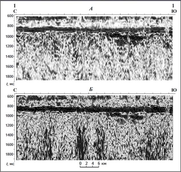 Рис. 1. ВРЕМЕННОЙ СЕЙСМИЧЕСКИЙ РАЗРЕЗ КУЮМБИНСКОГО МЕСТОРОЖДЕНИЯ ПО ПРОФИЛЮ 1-1, ОБРАБОТАННЫЙ ПО ФП-ТЕХНОЛОГИИ (А) И КОМПЛЕКСНЫЙ ФП-РАЗРЕЗ С ПРОГНОЗОМ ЗОН ПОВЫШЕННОЙ ТРЕЩИНОВАТОСТИ (ЧЕРНЫЕ СУБВЕРТИКАЛЬНЫЕ ЗОНЫ) (Б)
