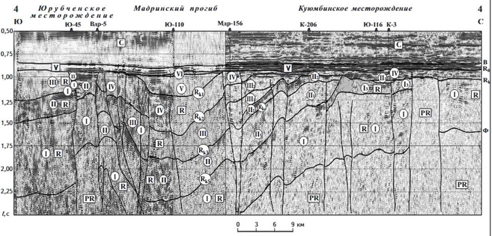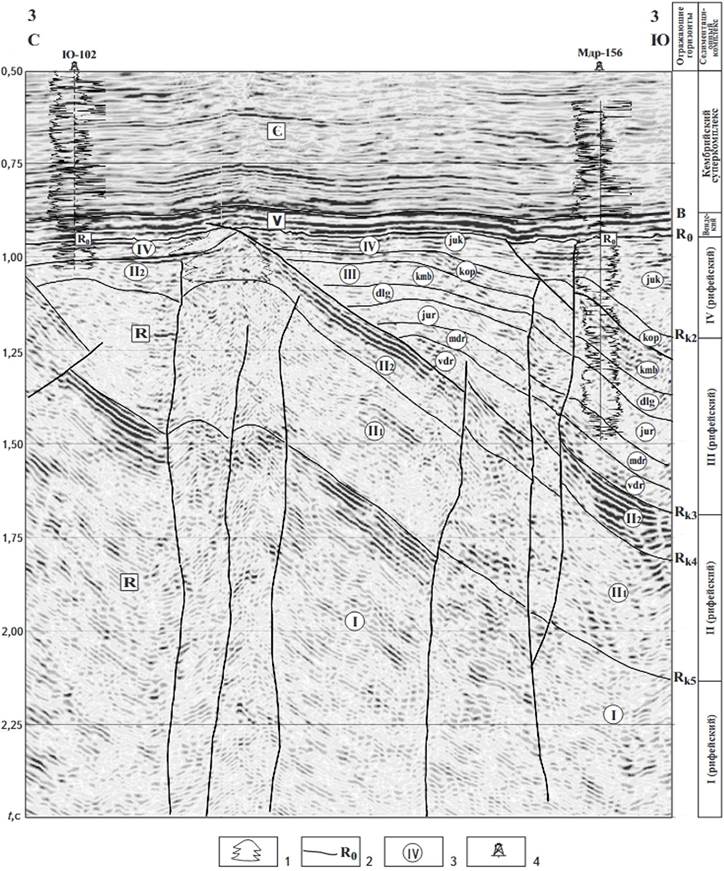 1 рифоподобные строматодитовые постройки; 2 отражающие горизонты; 3 номера рифейских седиментационных комплексов; 4 поисково-разведочные скважины; рифейские толщи: vdr вэдрэшевская, mdr мадринская, jur юрубченская, dlg долгоктинская, kmb куюмбинская, kop копчерская, juk юктенская