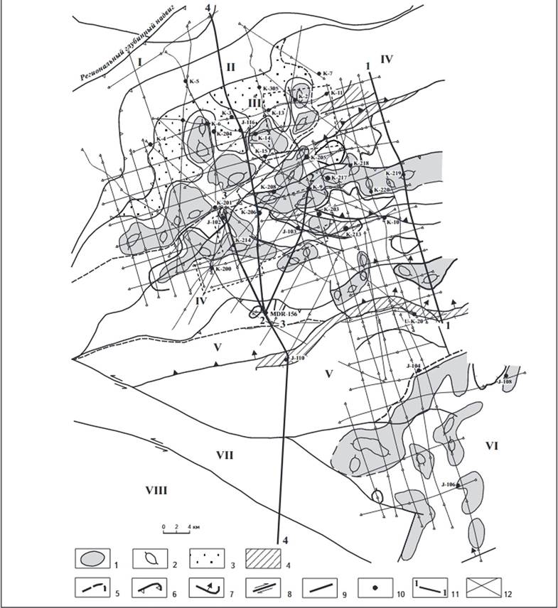 Локальные структурные элементы: 1 рифоподобные строматолитовые постройки, 2 локальные поднятия, 3 грабены и грабен синклинали, 4 горсты; 5 контуры зональных структурных элементов; разломы различной кинематической природы: 6 надвиги, 7 сбросы, 8 сдвиги, 9 невыясненной природы; 10 скважины; 11 линии сейсмогеологических профилей; 12 ceткa сейсмических профилей; крупные блоки района: I-IV Куюмбинского участка, V Мадринского прогиба, VI Терско Камовского участка, VII VIII Юрубченского yчастка