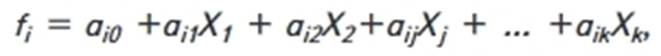 где i - номер группы; 1 <= i<= m; m - число групп; Xj - наблюдаемые показатели (например, концентрации элементов в пробе); 1 <= j < k; k - число наблюдаемых показателей; aij - коэффициенты линейной комбинации. При классификации образец признается принадлежащим к той группе, для которой значение fi максимально.