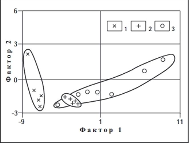 Геохимическое разнообразие доломитов подтверждается также результатами факторного анализа (рисунок) спектральных данных. На графике наглядно видно, что фигуративные точки, соответствующие разновозрастным доломитам, концентрируются в обособленных полях по возрастному признаку.