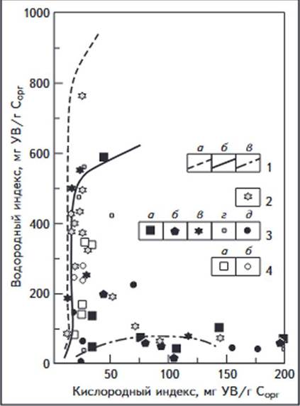 1 - тип ОВ: а-I, б-II, в-III; .2-данные по обнажениям майкопского возраста; 3 - данные по грязевулканическим выбросам: а - майкопского, б - позднемайкопского, в - позднемиоценового, г - сарматского, д - чокракского возраста; 4 - данные по керну: а - майкопского, б - эоценового возраста