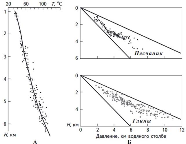 Рис. 2. РАСПРЕДЕЛЕНИЕ ЗНАЧЕНИЙ ТЕМПЕРАТУР (А) И ДАВЛЕНИЙ (Б) В ОСАДОЧНОМ ЧЕХЛЕ ЮЖНО-КАСПИЙСКОЙ ВПАДИНЫ (по данным Багир-Заде ФА., Нариманова АД., Бабаева Ф.Р., 1988)