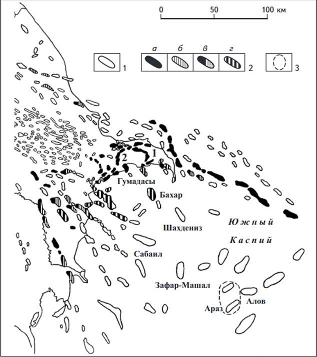 Рис. 3. СХЕМА РАСПОЛОЖЕНИЯ НЕФТЕГАЗОНОСНЫХ СТРУКТУР ЗАПАДНОГО БОРТА ЮЖНО-КАСПИЙСКОЙ ВПАДИНЫ