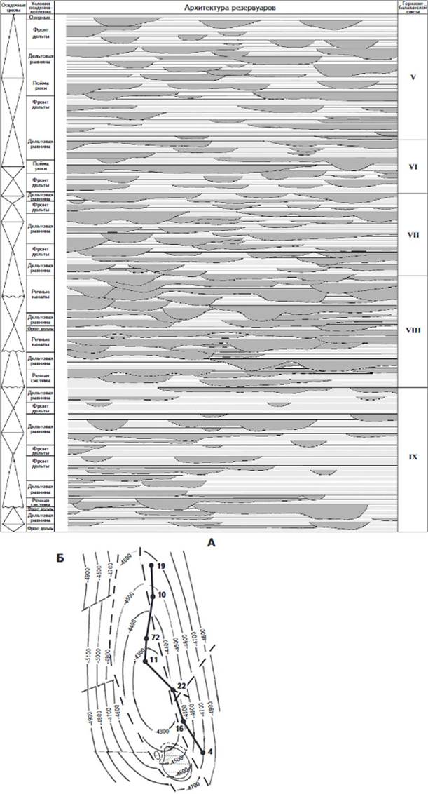 Рис. 7. ОСАДОЧНЫЕ ЦИКЛЫ, УСЛОВИЯ СЕДИМЕНТАЦИИ И АРХИТЕКТУРА РЕЗЕРВУАРОВ X ГОРИЗОНТА БЛЛАХЛНСКОЙ СВИТЫ И СВИТЫ ПЕРЕРЫВА (А) И СТРУКТУРНАЯ КАРТА ПЛОЩАДИ БАХАР ПО ПОДОШВЕ X ГОРИЗОНТА (Б)