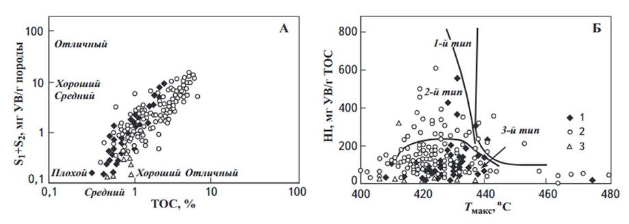 Изучение качественной характеристики ОВ (HI) показало, что в целом для пород всего исследуемого стратиграфического интервала характерен смешанный континентально-морской тип ОВ (2-й и 3-й типы), при преобладании континентальной составляющей (см. рис. 1, Б). Это означает, что породы исследуемого интервала наряду с нефтью образуют и газы, причем последние в относительно больших количествах.