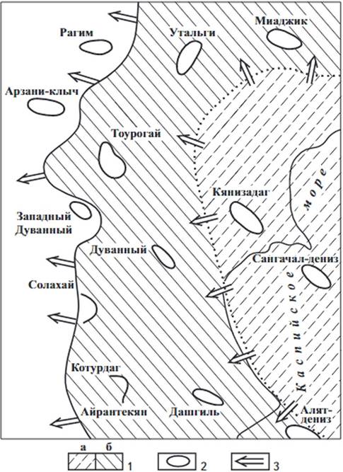 1 - зоны, благоприятные для образования нефти и ее вертикальной миграции в вышезалегаюшие отложения в миоценовых (а) и олигоценовых (б) породах; 2- структуры; 3 - направление латеральной миграции нефти
