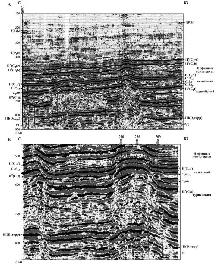 Рис. 1. ГЛУБИННОЕ СТРОЕНИЕ ТУРНЕЙСКОГО КАРБОНАТНОГО И ВИЗЕЙСКОГО ТЕРРИГЕННОГО КОМПЛЕКСОВ ПО ДАННЫМ СОВРЕМЕННОЙ СЕЙСМОРАЗВЕДКИ