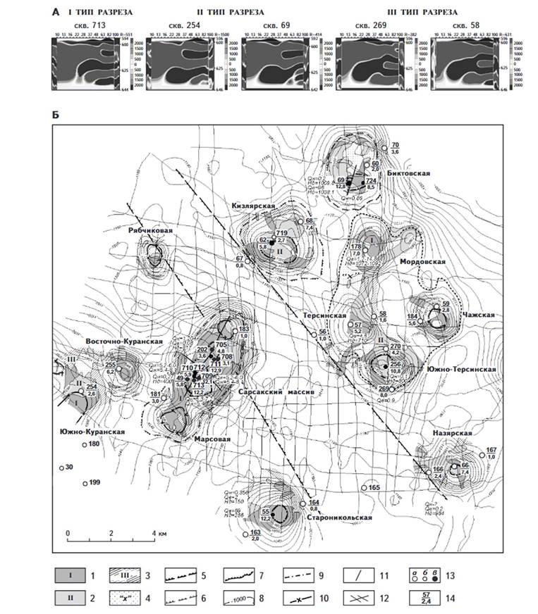 Зоны распространения: 1 -I типа разреза, 2-II типа разреза, 3- III типа разреза, 4 - нераспознанного типа; границы: 5 - отрицательной морфоструктуры (ответвления ККСП), 6 - барьерной группировки рифов, 7- атолловой группировки рифов; 8- изогипсы кровли турнейских отложений (ОГ IIп); контуры: 9 - залежей, 10- перспективных объектов; 11- дизъюнктивные дислокации (латеральные флюидоупоры); 12- линии сейсмопрофилей; 13- скважины: а - разведочные, б- эксплуатационные, в- давшие нефть иди нефтяные по данным ГИС; 14 - скважина: числитель - номер скважины, знаменатель - эффективная толщина, м