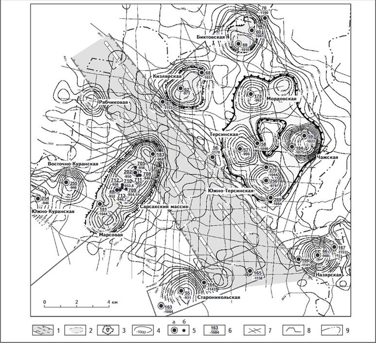 Морфоструктуры: 1 - ответвление ККСП, 2- барьерная группировка рифов, 3 - атолловидная группировка рифов; 4 - изогипсы кровли турнейских карбонатных отложений (по Н.Н. Зайцевой, АО “Удм. ГЭ”, 2002 г.); 5 - скважины разведочные (а) и эксплуатационные (б); 6 - эффективные толщины, м/абсолютная отметка кровли турне, м; 7-линии сейсмопрофилей; границы: лицензионных участков Кучуковского месторождения, 9 - административные