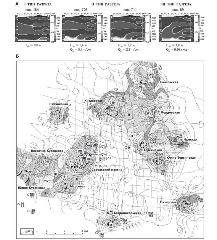 К востоку от рассмотренной надрифовой гряды в сводовых частях локальных поднятий (Терсинского, Южно-Терсинского, Чажского, Староникольского и Назярского) преобладает благоприятный II тип разреза. Эти разрезы характеризуются лучшей сортировкой песчаного материала, что, возможно, связано с переходом от аллювиального к аллювиально-дельтовому типу отложений в бассейновой части исследуемой территории и периодическим перемывом волнениями песчаного материала в пределах поднятий. Соответственно на юге и востоке района повышаются перспективы сводовых частей поднятий. Например, склоновые скв. 59 на Чажском и скв. 178 на Мордовском поднятиях вскрыли неблагоприятный III тип разреза: эффективные толщины пласта Сbb составили всего 0,6 и 1,2 м, к тому же пласт в обеих скважинах оказался водонасыщенным. Однако на вершинах этих локальных поднятий прогнозируемые объекты по данным СВАН оказываются в зонах распространения высокопродуктивных I и II типов разреза, что подтверждает их перспективность.