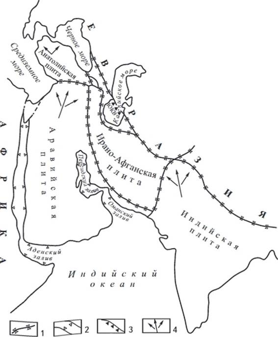 Границы. 1 - коллизионные, 2- спрединговые, 3 - субдукционные; 4 - направление перемещения литосферных плит