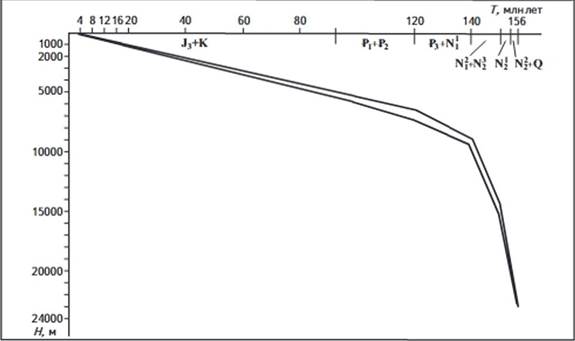 Следует также отметить влияние геодинамической обстановки не только на формирование мощности отложений отдельных литофациальных комплексов, но и на темпы их захоронения. Так, если время погружения палеоцен-эоценовых отложений после их образования составляет порядка 36 млн. лет с их перекрытием за это время примерно 17-км толщей отложений, то майкопская серия менее чем за 16 млн лет была перекрыта толщей отложений мощностью до 13,5 км, т.е. темпы погружения майкопской толщи были значительно выше, чем предыдущих. Среднемиоцен-понтические отложения за 5 млн лет были перекрыты более чем 9-км толщей осадков, что свидетельствует о еще более высоких темпах их захоронения. Сказанное более наглядно можно проследить на графике интенсивности прогибания дна западного суббассейна Южно-Каспийской впадины (рис. 4).