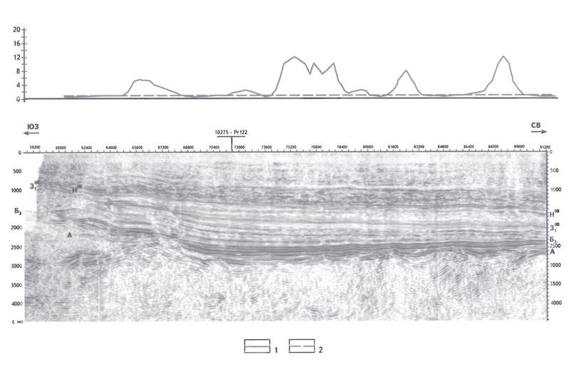 При сопоставлении геохимических данных с временным разрезом ОГ Т по линии сейсморазведочного профиля 2193004 видно, что над северо-восточной частью временного разреза 2193004 находятся две широкие и контрастные геохимические аномалии. Выраженные ловушки существуют на уровне отражающих горизонтов А-Т2, где возможно тектоническое и литологическое экранирование залежей (рис. 6). Формирование ловушек структурного или комбинированного типа возможно только в юрских отложениях (зона пересечения сейсморазведочного профиля 2193004 с сейсморазведочными профилями 2193014, 2193015, 2193020 и 2193017) (см. рис. 6).