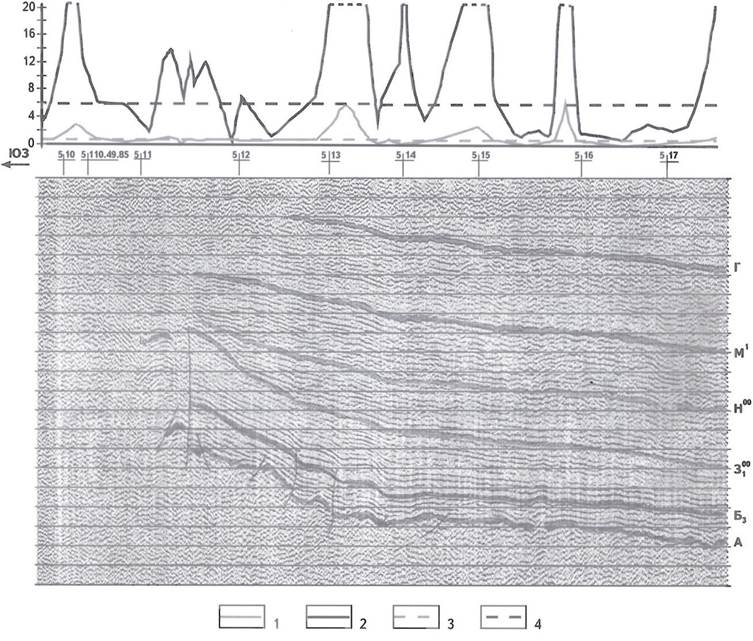 Рис. 6. СОПОСТАВЛЕНИЕ ГЕОХИМИЧЕСКИХ ДАННЫХ С ВРЕМЕННЫМ РАЗРЕЗОМ МОВ ОГТ ПО ЛИНИИ СЕЙСМОРАЗВЕДОЧНОГО ПРОФИЛЯ 2193005 (Мантойский лицензионный участок)