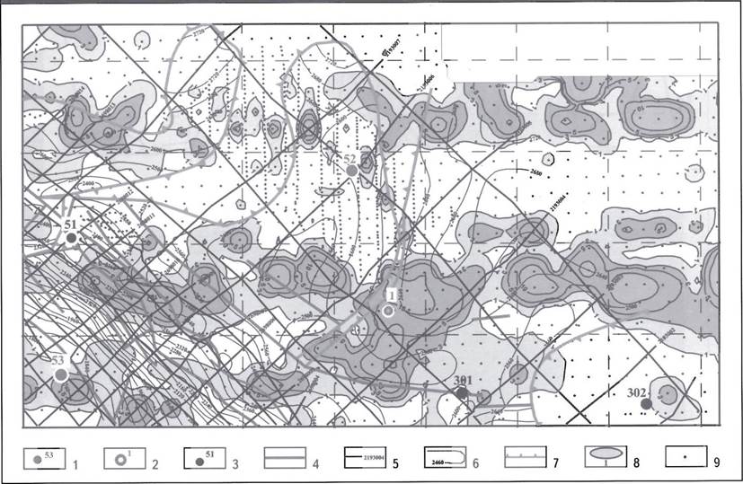 Разведочные скважины (301, 302), пробуренные в рассматриваемом районе до постановки геохимической съемки, не выявили залежей УВ и находятся за пределами геохимических аномалий. Разведочная скв. 51 была начата бурением в период проведения геохимической съемки и по результатам этой съемки прогнозировалась как непродуктивная. Испытание этой скважины подтвердило прогноз по геохимическим данным (см. рис. 5).