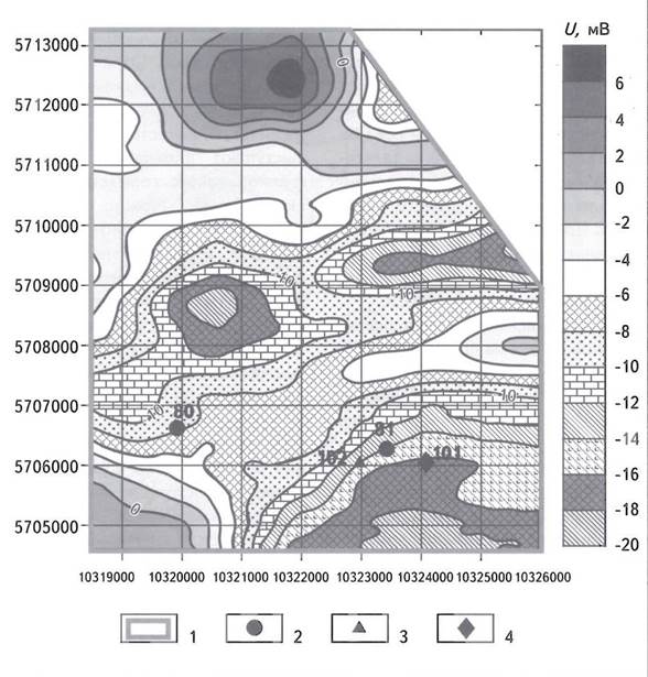 1 - зоны субвертикальных неоднородностей и тектонических нарушений; значения ЕП: 2 - отрицательные, 3- положительные