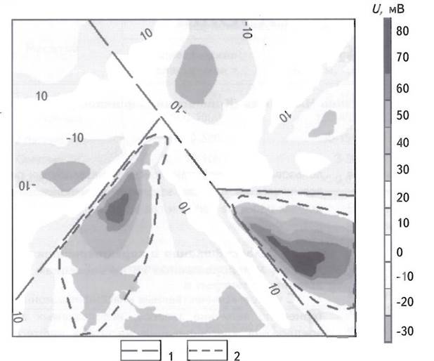 Появление положительных аномалий электрического поля в данном случае, вероятнее всего, связано с минеральным составом и окислительно-восстановительными характеристиками верхней части разреза этих тектонических районов.