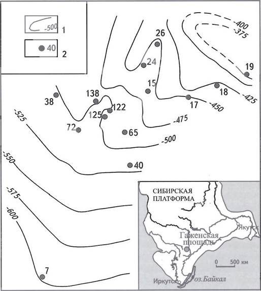 Рис. 1. РАСПОЛОЖЕНИЕ СКВАЖИН НА СТРУКТУРНОЙ КАРТЕ ГАЖЕНСКОЙ ПЛОЩАДИ (Конторович А.Э. и др., 1986)