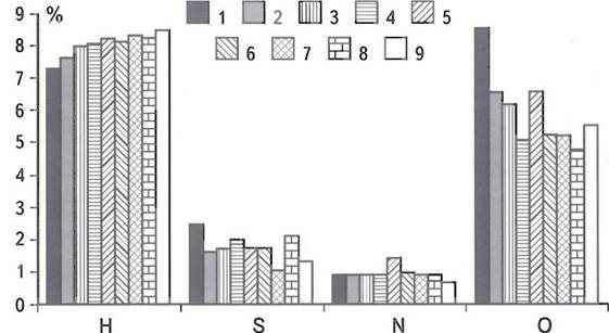 Примечание: Сα - концентрация углерода в насыщенных группах, находящихся в α-положении к ароматическому кольцу; Сβγ - концентрация углерода в насыщенных группах, находящихся в β-, γ-положении к ароматическому кольцу; Саr(к) - концентрация углерода в узлах конденсации ароматических структур; Саг(п) - концентрация углерода в периферийных позициях ароматических структур; Саг(3) - концентрация углерода в замещенных положениях ароматических структур; Far - степень ароматичности.