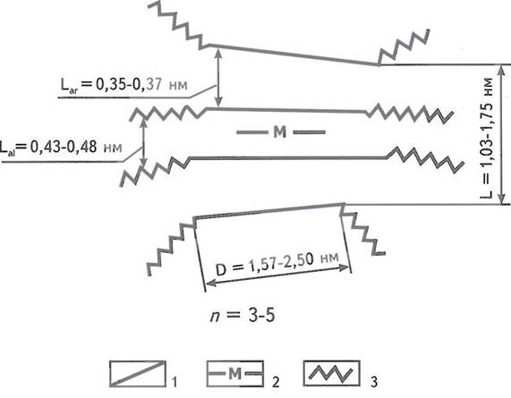 1 - конденсированные нафтеноароматические ядра; 2 - металлопорфириновые комплексы; 3- алифатические цепи; Lar - расстояние между ароматическими сдоями; Lal - расстояние между алифатическими ответвлениями; D - диаметр конденсированных ароматических ядер; L - толщина частицы асфальтенов: п - число слоев в пачке