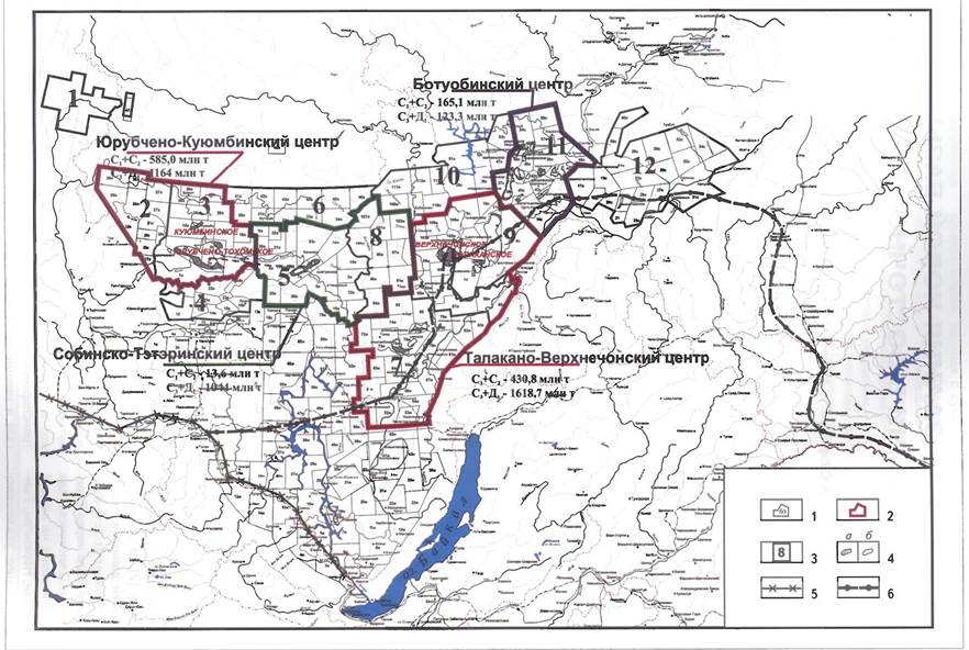 1 - лицензионные участки и их номера; 2- контуры перспективных центров; 3- ресурсные зоны (1 - Бахтинская, 2- Вельминская, 3- Камовская, 4 - Иркинеевская. 5-Катангская, 6 -Чуньская, 7- Ярактинско-Дулисьминская, 8- Алтыпско-Тетейская, 9- Талаканско-Верхнечонская, 10-Кочумско-Кобулахская, 11-Ботуобинская, 12 - Березовско-Наманинская); 4 - месторождения: а - нефтяные, б - газовые; нефтепроводы: 5 - действующие, 6 - предполагаемые