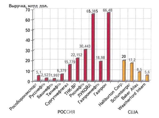 Рис. 1. СОПОСТАВЛЕНИЕ ДОХОДОВ НЕФТЕГАЗОДОБЫВАЮЩИХ КОМПАНИЙ РОССИИ И КОМПАНИЙ НЕФТЕГАЗОВОГО СЕРВИСА США