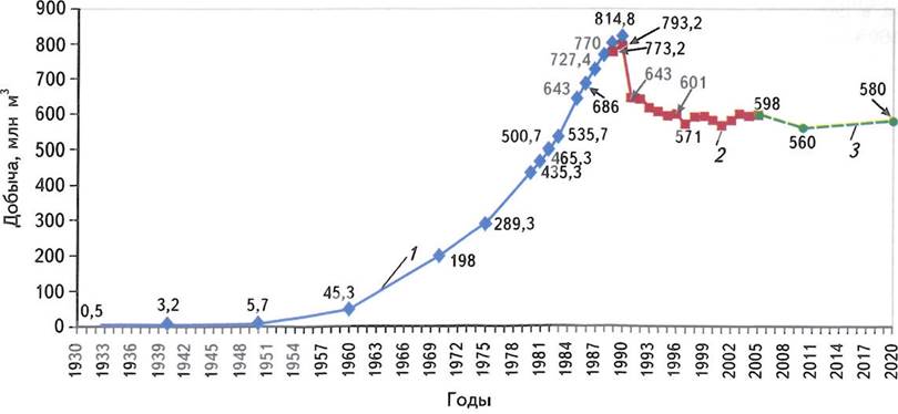 В 1950-1960 гг. в Ставропольском и Краснодарском краях было открыто большое число газовых месторождений (Северо-Ставропольское, Каневское, Ленинградское и др.), разработка которых обеспечила дальнейший рост добычи природного газа (рис. 2). Для развития газовой промышленности большое практическое значение имело открытие в 1964 г. Вуктыльского и в 1966 г. Оренбургского газоконденсатных месторождений. Дальнейшее развитие добыча и сырьевая база европейской части страны получили с открытием в 1976 г. Астраханского нефтегазоконденсатного месторождения и его освоением.