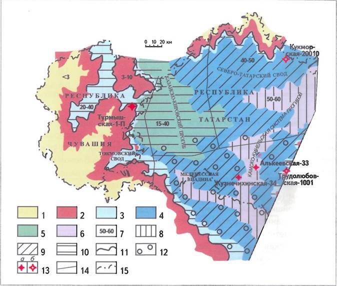 Седиментационные зоны: область преобладания карбонатной подформации: 1 - отложений закрытого шельфа и прибрежных лагун, 2- отложений барьерной рифовой системы; область преобладания карбонатно-глинистой подформации: 3 - отложений верхней части склона (преимущественно карбонатный разрез), 4 - отложений нижней части склона (карбонатно-глинистый разрез), 5- отложений верхней части склона, перекрытых конусами выноса песчано-глинистых отложений услонской свиты, 6 - депрессионных отложений (преимущественно глинистый разрез); 7- содержание материнских пород в составе средне-верхнефранской толщи, %; категории материнских пород по генерационному потенциалу (по К.Е. Peters и др.): 8- очень хорошие и отличные, 9- хорошие и очень хорошие, 10- средние (удовлетворительные); 11 - граница распространения средне-верхнефранской нефтематеринской толщи; 12 - основной очаг генерации УВ (зона распространения зрелых пород); 13- геохимически изученные скважины: а - на которых основан прогноз, б - подтвердившие сделанный ранее прогноз; 14 - границы основных тектонических элементов; 15- административные границы