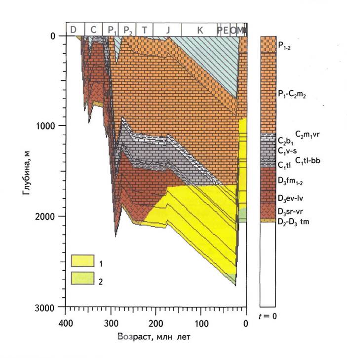 Рис. 5. ПРИМЕР ДИАГРАММЫ ИСТОРИИ ПОГРУЖЕНИЯ И ПРОГРЕВА ОТЛОЖЕНИЙ (одна из скважин в Мелекесской впадине)