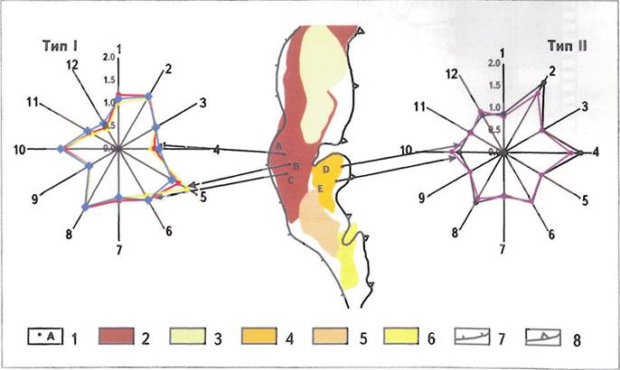 На рис. 8 показаны результаты проведенных во ВНИГНИ анализов нефтей пермокаменноугольной залежи на одном из месторождений в Тимано-Печорской НГП. На основании литолого-фациальных исследований установлены значительные различия в строении карбонатного резервуара в разных зонах залежи. В восточной части залежи (зона А) он относительно однороден, а в западной (Б) характеризуется сильной латеральной и вертикальной изменчивостью, связанной с наличием большого числа глинистых пластов в карбонатном резервуаре. Целью геохимических исследований было получение информации о флюидосообщаемости пород-коллекторов в пределах залежи. Для этого было исследовано несколько десятков образцов нефтей из разных зон залежи. Полученные результаты показали идентичность звездных диаграмм всех изученных нефтей из зоны А и многих образцов из зоны Б (тип I), что свидетельствует о хорошей вертикальной и латеральной флюидосообщаемости пород-коллекторов в пределах большей части залежи. Наряду с этим, в ряде скважин из зоны Б получены нефти, заметно отличающиеся от основной массы образцов по конфигурации звездных диаграмм (тип II). Наблюдаемая “аномальность” состава нефтей дает основание предполагать наличие в пределах пермокарбонового резервуара отдельных изолированных участков, которые необходимо локализовать для рационализации разработки залежи