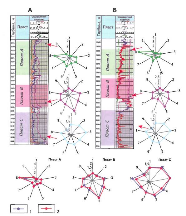 Рис. 9. СРАВНЕНИЕ ЗВЕЗДНЫХ ДИАГРАММ ХЛОРОФОРМЕННЫХ БИТУМОИДОВ ИЗ РАЗНЫХ ПЛАСТОВ РАЗРЕЗОВ скв. 1 (А) и 2 (Б)