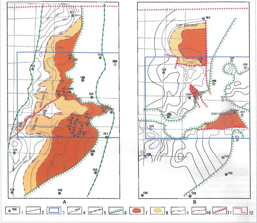Здесь поля контролируются главным образом структурным планом и закартированной зоной замещения коллекторов. Залежи локализуются в широкую полосу субмеридионального простирания. При этом по результатам эксплуатационного бурения данного месторождения новая модель строения и нефтеносности полностью подтверждается. На настоящий момент пробурено уже 13 эксплуатационных скважин, подтвердивших нефтяное поле новой модели залежи, тогда как по старой модели половина из них должна была вскрыть воду.