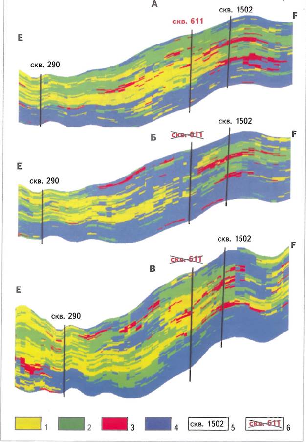 А - с учетом данных по скв. 611, Б - без учета данных по скв. 611. В - без учета данных по скв. 611, но с учетом сейсморазведки; 1 - песчаник; 2- алевролит; 3- плотный и/или карбонатизированный песчаник; 4 - аргиллит; скважины: 5 - используемые при построении модели, 6- не используемая при построении модели