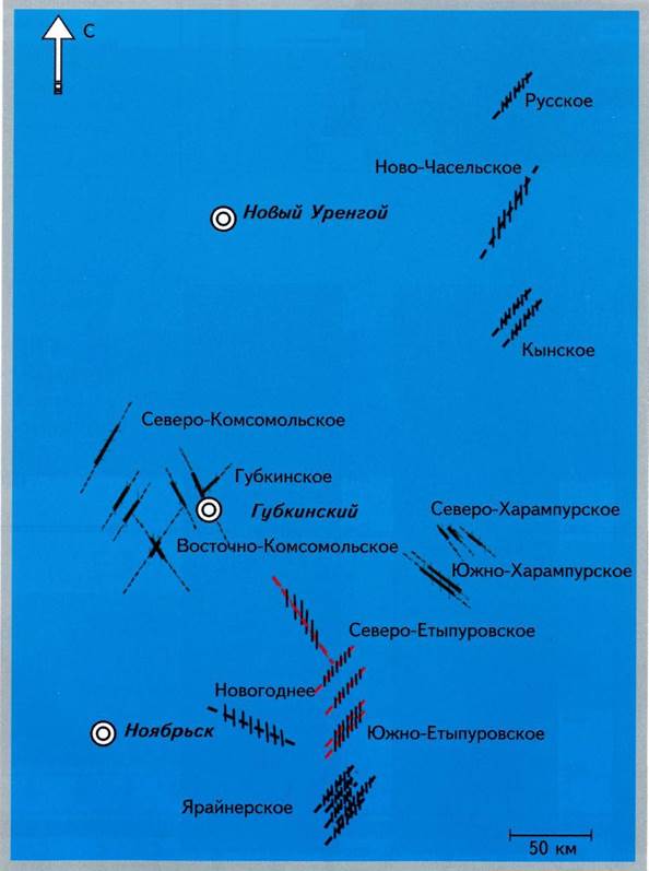 Очевидны тектоническая природа и связь с глубинными недрами горизонтальных сдвигов фундамента Еты-Пуровского вала, определивших линейные деформации чехла по кинематической схеме транстенсии, формирование приразломных структур по механизму горизонтального сжатия (продольного изгиба) и пластического нагнетания пород в ядра складок, формирование "окон проницаемости" на телах СГС, общее раскрытие недр и разгрузка УВ в осадочном чехле по механизму вертикальной струйной фильтрации.