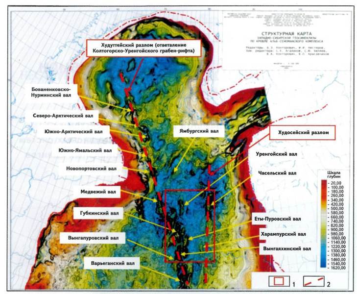 1 - положение площади с доказанными сейсморазведкой СГС на фоне регионального строения севераЗападной Сибири; 2 - предполагаемые надпорядковые линейные швы, связанные с региональными сдвигами фундамента на теле активизированных на неотектоническом этапе фрагментов (ответвлений) Колтогорско-Уренгойского грабен-рифта (Худуттейский и Худосейский разломы); положение крупнейших валов и локальных понятий характеризуется кулисным сочленением с линиями региональных сдвигов фундамента