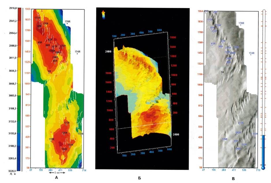 А - структурная карта; Б - куб структурной поверхности (аксонометрия); В - карта углов наклона (угол подсветки 270°)
