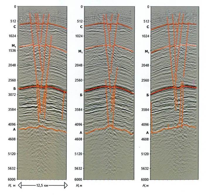 В разрезе корни зон деструкции и дезинтеграции пород на ширину динамического влияния горизонтального сдвига, сужаясь клином, уходят ниже кровли фундамента до глубин, освещенных сейсмической записью. Ниже кровли фундамента (горизонт А) просматривается вертикальный столб деструкции пород, связанный с "окном проницаемости" (Г.Л. Поспелов). Внутри структуры обрушения свода поднятия меловые горизонты выгнуты вверх (область растяжения), а юрские горизонты вогнуты вниз (область сжатия) (см. рис. 4 на цветной вкладке).