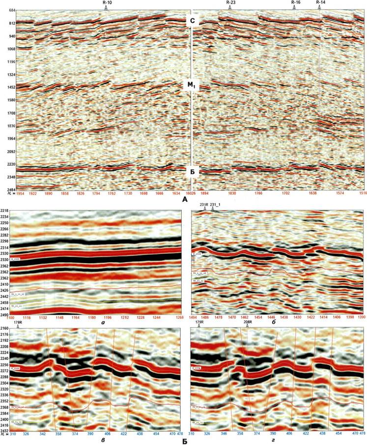 А - 2D (Роснефть-Пурнефтегаз, 2001); Б - 3D (ЦГЭ, 2004)