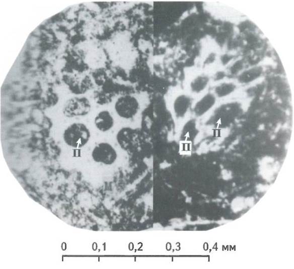 5. Органогенные силициты представлены радиоляритами и спонголитами. Это трещинно-поровый тип коллекторов с унаследованной вторичной пористостью. Пустотное пространство в этих породах представлено порами, размеры которых соответствуют размерам кремнеаккумулирующих организмов - 0,5-4,0 мм (рис. 6). Поры сообщаются между собой трещинами, раскрытость которых составляет 0,003-0,050 мм. Открытая пористость, замеренная в шлифах, изменяется от 5,3 до 19,2 %, а проницаемость в отдельных случаях достигает 12,8*10-3 км2. Эти породы установлены в верхней части палеозойского разреза Герасимовского и Северо-Останинского месторождений.