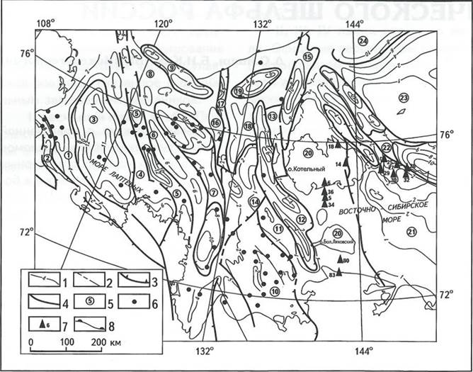 1 - стратоизогипсы по подошве чехла, км; 2- разломы; границы структур: 3 -I порядка, 4 - II и III порядков; 5 - структуры I порядка (цифры в кружках): 1 - Лено-Таймырская зона пограничных поднятий, 2-Оленекско-Бегичевский грабен, 3- Южно-Лаптевский прогиб, 4 - Трофимовское поднятие, 5 - Усть-Ленский грабен, 6 - вал Минина, 7 - Омолойский прогиб, 8 - Западно-Лаптевское поднятие, 9 - Северо-Лаптевский окраинно-шельфовый прогиб, 10 - Шелонская структурная терраса, 11- Столбовской горст, 12- Бельковско-Святоносский прогиб, 13- Бельковский горст, 14 - Санниковская седловина, 15 - Анисинский прогиб, 16 - Центрально-Лаптевский горст, 17 - Северо-Омолойский грабен, 18 - Восточно-Лаптевское поднятие, 19 - впадина Толля, 20 - Котельническо-Святоносское поднятие, 21 - Благовещенская структурная терраса, 22 - Новосибирский прогиб, 23 - поднятие Ле-Лонга, 24 - прогиб Вилькицкого (западное окончание); 6 - аномальное содержание УВ-газов в донных осадках (>0,005 см3/кг); 7- картировочная скважина и ее номер, где установлены проявления УВ-газов; 8- бровка шельфа