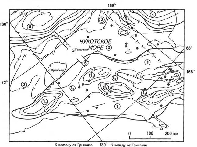 Структуры (номера в кружках): 1 - Южно-Чукотский прогиб (11- впадина Лонга, 12 - Ушаковская седловина, 13 - Северо-Шмидтовская впадина, 14 - впадина Хоуп, 15 - поднятие Онман, 16 - Южно-Шмидтовская впадина, 17 - Колючинская впадина, I8 - Инкигурское поднятие), 2-Врангелевско-Геральдское поднятие, 3- вал Барроу, 4 - прогиб Колвилл, 5 - Северо-Чукотская впадина прогиба Вилькицкого, 6- Чукотский желоб; остальные уел. обозначения см. на рис. 1