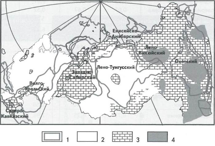 1 - нефтегазоносные бассейны России; зоны с разными значениями теплового потока, мВт/м2: 2- низким (10-40), 3 - средним (40-60), 4 - высоким (60-100)