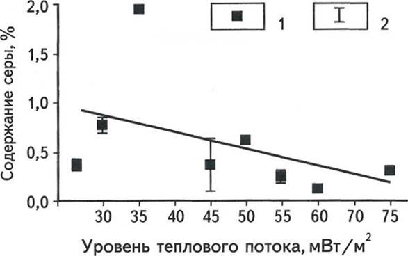Рис. 2. ИЗМЕНЕНИЕ СОДЕРЖАНИЯ СЕРЫ В НЕФТЯХ В ЗАВИСИМОСТИ ОТ УРОВНЯ ТЕПЛОВОГО ПОТОКА