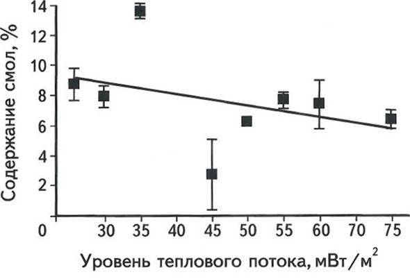 Линии трендов изменения содержания серы, смол и асфальтенов в нефтях подтверждают, что с ростом уровня теплового потока средние значения этих показателей состава нефтей уменьшаются, а для парафинов, наоборот, наблюдается рост их содержания в нефти (см. рис. 5).